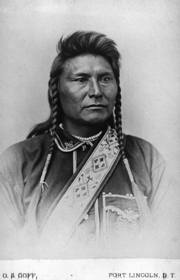 Before entering the landscape of the Bear Paw Mountains of Montana, Joseph’s people survived fierce fighting at Canyon Creek and left the battlefield with General Howard far behind. They were unaware, however, of a new threat coming toward them from the southeast. Moving rapidly were about 520 officers, soldiers, scouts and civilians under the command of Colonel Nelson A. Miles. The Nez Perce made camp on September 29, 1877 along Snake Creek in the Bear Paws. They now numbered about 700 people, with more than 200 warriors. The weather turned cold, but as they made a place to sleep they felt somewhat secure protected by the rolling hills and their belief that Howard’s soldiers had given up the chase at last. Knowing Canada was only about 40 miles north, they began at last to feel as if they would reach safety. But unknown to the sleeping Nez Perce, Miles' Cheyenne and Lakota scouts were searching frantically for their camp. Many of these scouts had fought against Miles only a year earlier during the Sioux War of 1876.