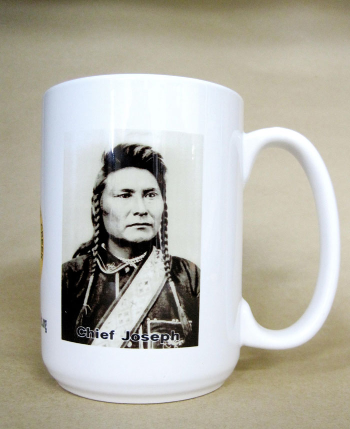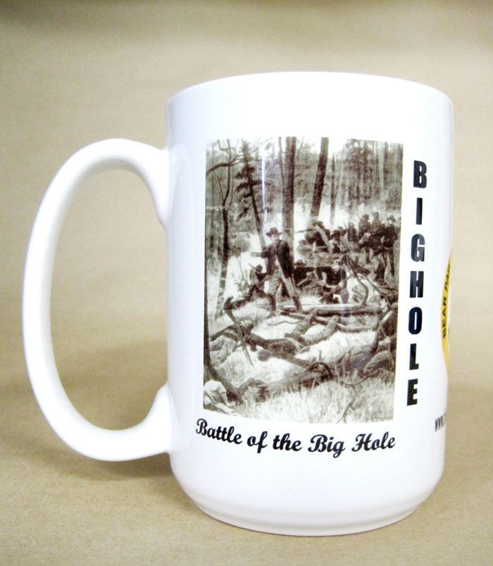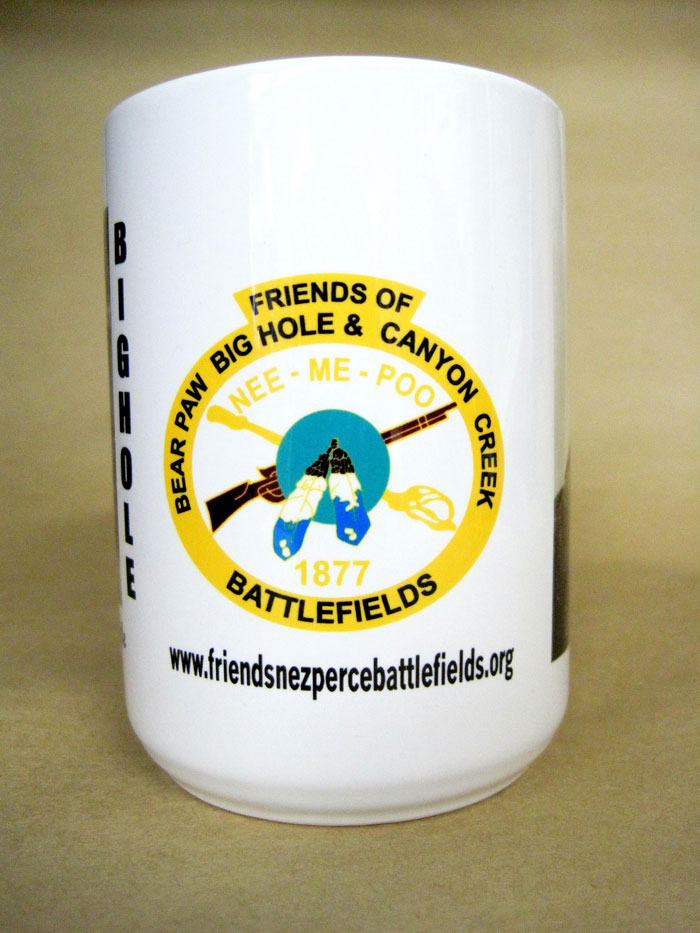 The Friends of Bear Paw, Big Hole & Canyon Creek Battlefields is a non-profit organization ready to do business with helping the National Park Service at the respective battle sites. The most important asset to help us grow and reach our goals is you, the membership. By becoming a member of this Friends' organization you show that you care about the historical places that make-up part of the Nez Perce story. As a member you will receive benefits such as a newsletter, invitation to an annual general membership meeting, and other special events to take place at the battle sites. You can join in one of two ways. 1.) Credit card -- select a "Buy Now" button below. You may use your credit card via PayPal, which is safe, easy to use, and very secure. PayPal no longer requires one to register with them to use the service, so joining or renewing with the Friends is faster and easier. 2.) You can send in a check or money order (see mail in form below). Other Membership Benefits: All new members who join at the $25 contributing level or higher receive a free lapel pin. Also, all new members or renewals paid in the sum of $75 champion level or higher receive as a gift a handsome large Friends mug with an imprinted photo of both Chief Joseph and an 1895 artist’s rendition of the Battle of the Big Hole and also of our beautiful Friends logo. Shipping and handling costs are included. You will enjoy the beverage of your choice with this beautiful mug while helping a very worthy cause as well. If you join or renew at the $100 patron level or higher, you will also receive a free mug in addition to the lapel pin. Click on the photos below to enlarge the three sides of the mug.